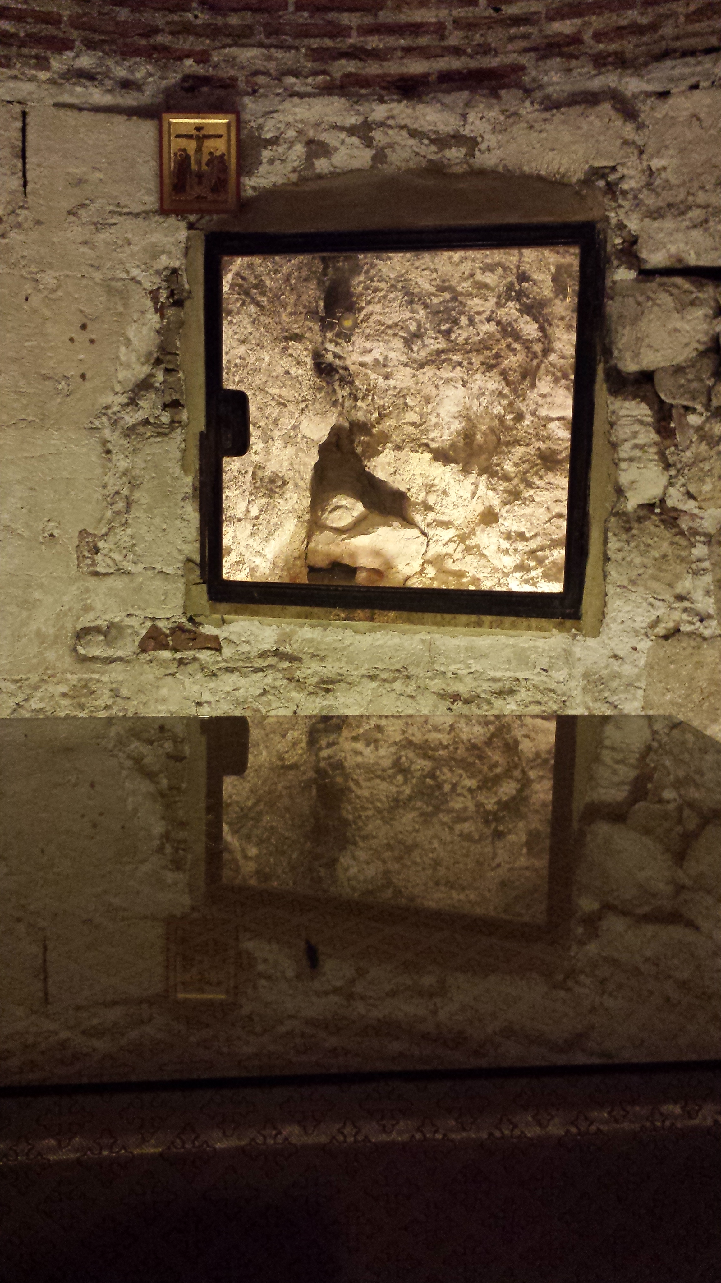 Bishop Greg at the shrine.  Pilgrims can kneel under the altar and reach down through a hole to touch the bed rock.