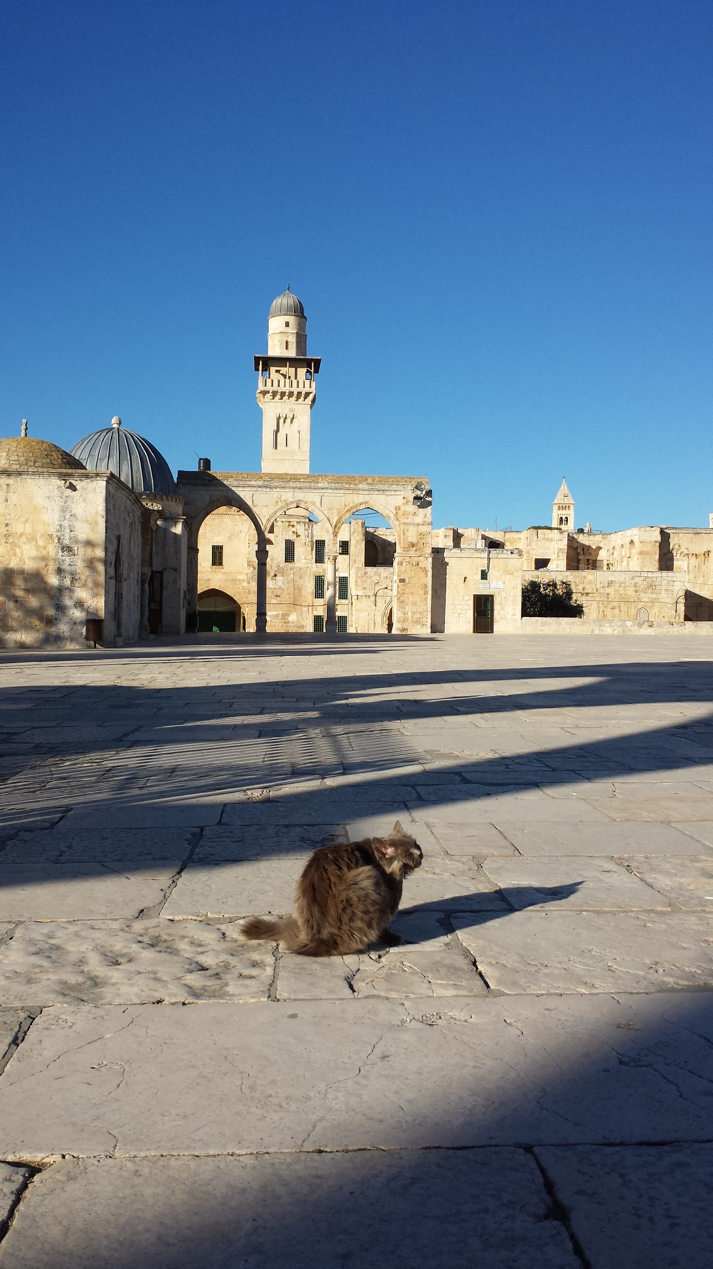 Even though there’s a partition between the men and women, I snuck into the women’s section in Rachel’s interior coat pocket and was able to put my forepaws on the wall as she placed her hands on the wall for prayer. The sounds of women weeping were close all around us in the press of the crowd. After prayers at the wall are complete, it is a practice for many to back up away from the wall so that one does not turn a back to it. When you’re up close to the wall or touching it, you can see small bits of paper on which prayers have been written that visitors have poked into the cracks between the stones.