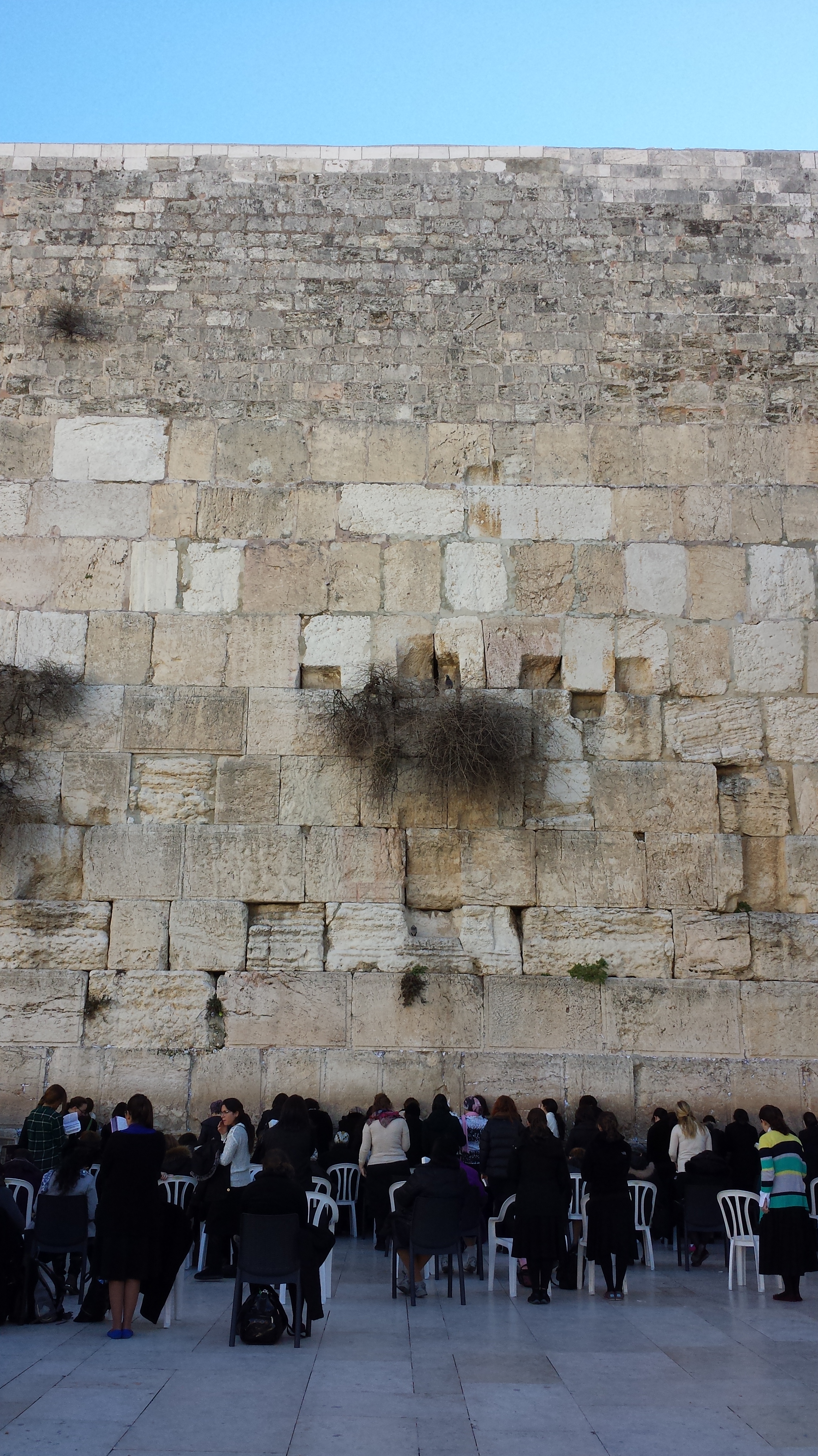 The Western Wall is a site that is very important to the Jewish people. As a worshipping area, the wall is divided into sections for men and women, with a partition between the two areas. The men’s section takes up the lion’s share of the wall, nearly ¾ of the available wall, and the men have an enclosed heated section as well. The women cram themselves into a smaller section (no heated space). It is popular to hold bar mitzvahs in the men’s section. Mothers who want to view their son’s ceremony must stand on the plastic chairs of the women’s section to peer over the partition at the proceedings. It’s common for the women to throw candy into the event as a symbol of blessing.