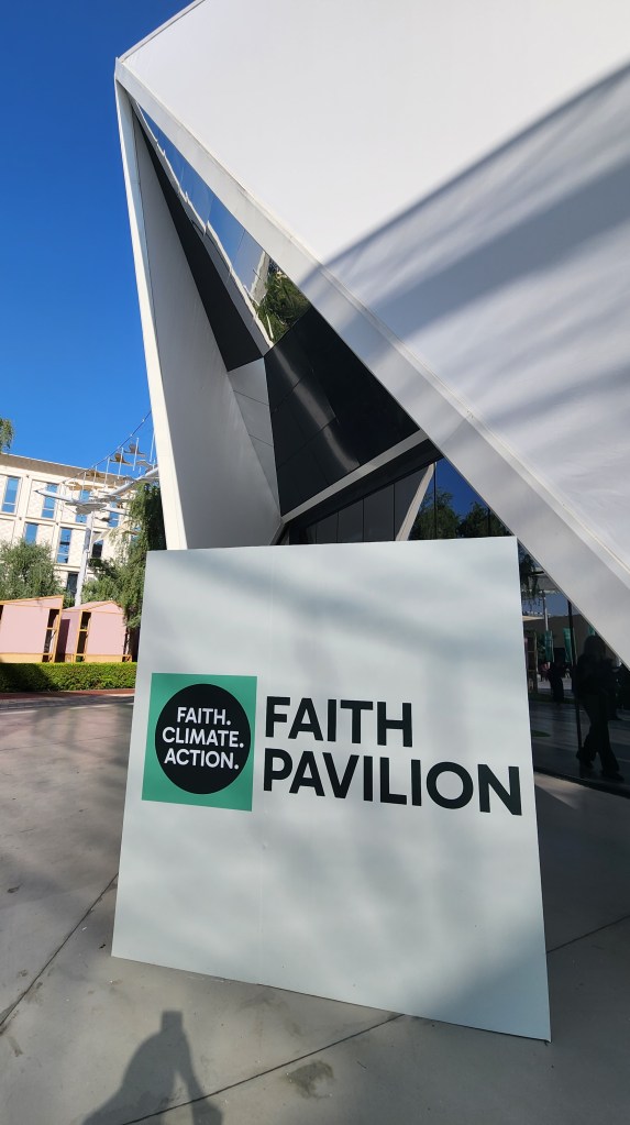 This year’s COP was the first time for the Faith Pavilion, which in the case of Dubai was facilitated by the local host Muslim Council of Elders. The Pavilion had three strategic objectives:  1) Encourage faith-based organizations (FBOs) to engage with country delegates and increase their capacity to advocate for specific negotiation outcomes at COP28 and beyond, 2) Increase visibility for environmental advocacy work by FBOs and other spiritual and religious actors, particularly those on the frontlines of the climate crisis and how this work contributes to the goals of the Paris Agreement. Promote multi, and 3) highlight faith understanding by creating a space for spiritual reflection, artistic expression and prayer.